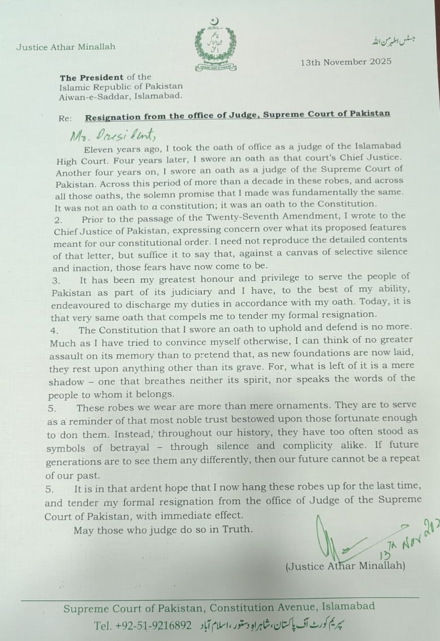 “I am unable to uphold my oath sitting inside a court that has been deprived of its constitutional role; resignation therefore becomes the only honest and effective expression of honouring my oath. Continuing in such a version of the Supreme Court of Pakistan, would only suggest that I bartered my oath for titles, salaries, or privileges,” reads Justice Mansoor’s resignation letter.