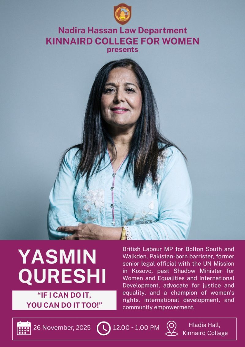 LAHORE – Nadira Hassan Law Department (NHLD) – Kinnaird College for Women is set to host a distinguished guest, British Labour MP Yasmin Qureshi, for a motivational and insightful talk on Tuesday, November 26, 2025, from 12:00 PM to 1:00 PM.